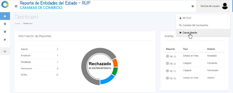 Para salir del sistema despliegue el menú de opciones que se encuentra haciendo clic sobre el nombre de su usuario y finalmente presione Cerrar Sesión.