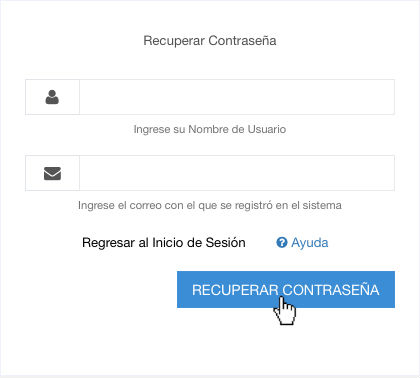 Ahora complete los campos correspondientes con su nombre de usuario y el correo electrónico que registró en el sistema. Pulse clic sobre el botón Recuperar Contraseña y se enviará una nueva contraseña a ese correo electrónico con la que podrá ingresar nuevamente y posteriormente cambiarla a la que desee.