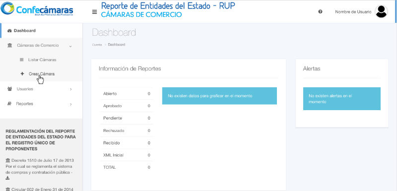 Para agregar una cámara de comercio ingrese en el menú de la izquierda Cámaras de Comercio y haga clic en Crear Cámara.