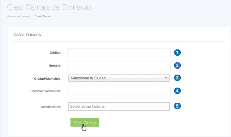 Para agregar una cámara de comercio ingrese los siguientes datos en los campos correspondientes y haga clic en Crear Cámara: