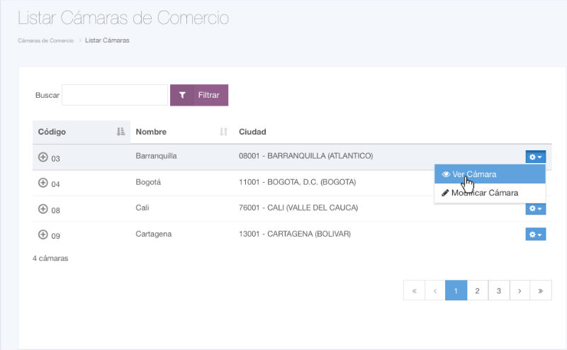 Haga clic en la opción Ver Cámara, que se encuentra en el menú de la cámara de comercio correspondiente, en el listado de cámaras de comercio.