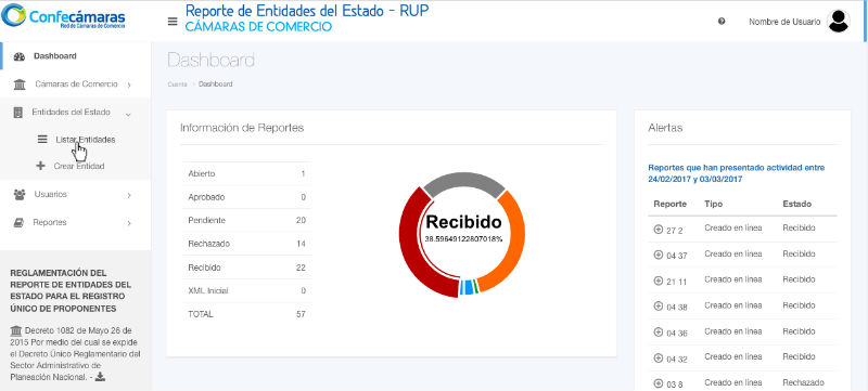 Para ver la lista de las cámaras de comercio que se han agregado, haga clic en la opción Listar Entidades que encontrará al desplegar el menú de Entidades del Estado, que se encuentra a la izquierda de la pantalla.