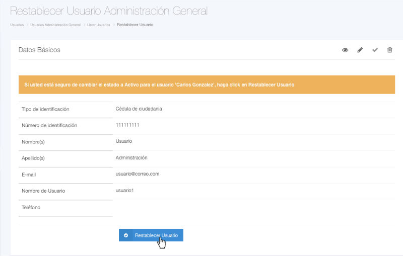 En la ventana siguiente se mostrará la confirmación de esta acción, revise la información del usuario y si está seguro de querer activarlo haga clic en Restablecer Usuario.