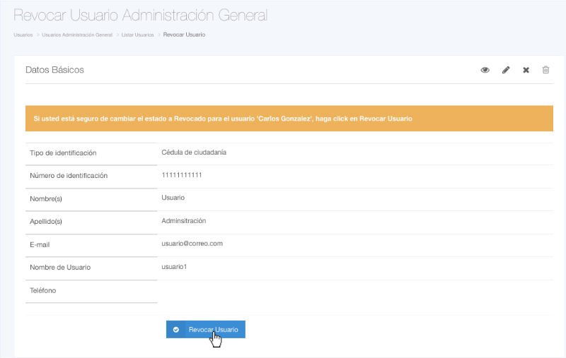 En la ventana siguiente se mostrará la confirmación de esta acción, revise la información del usuario y si esta seguro de querer revocarlo haga clic en Revocar Usuario.