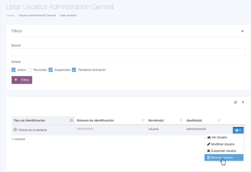 Haga clic en la opción Revocar Usuario, que se encuentra en el menú del usuario correspondiente, en el listado de usuarios de administración.