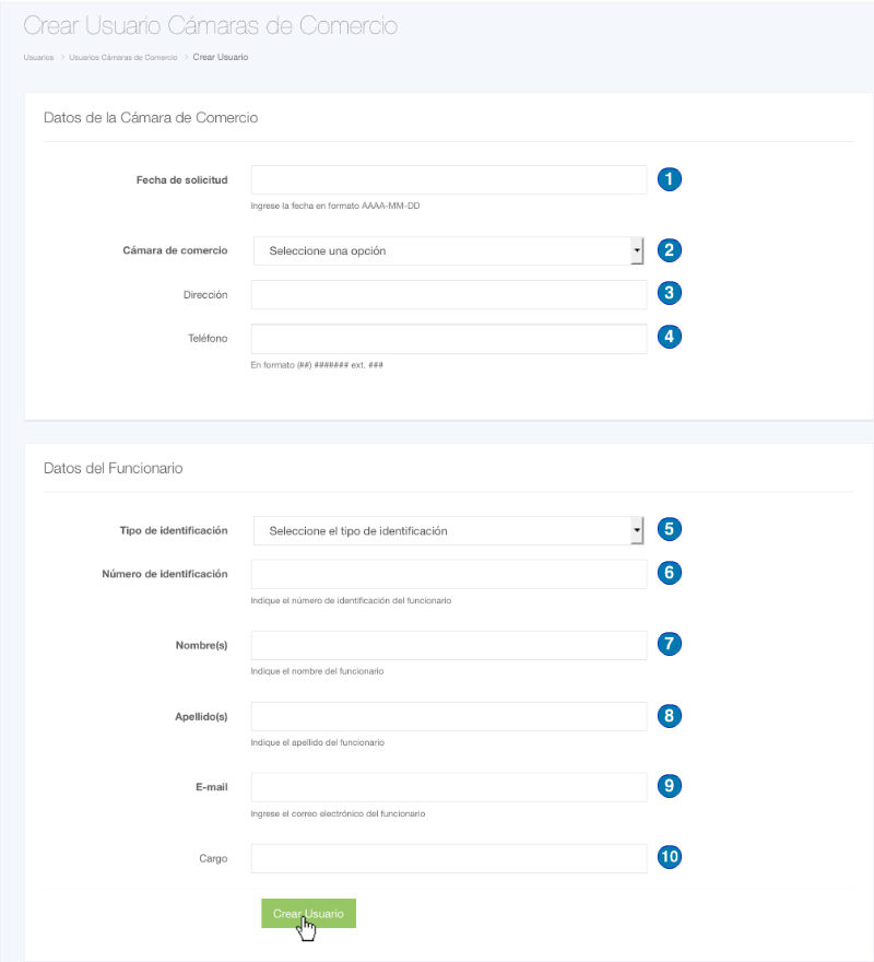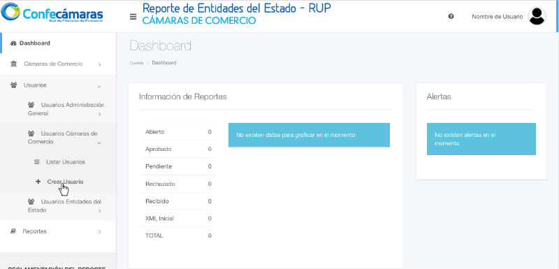 Para agregar un usuario de la cámara de comercio ingrese en el menú Usuarios Camaras de Comercio que se encuentra a la izquierda de la pantalla y haga clic en la opción Crear Usuario.