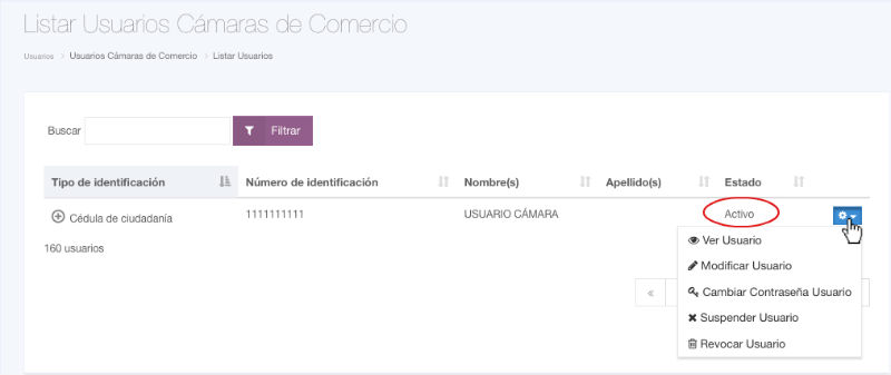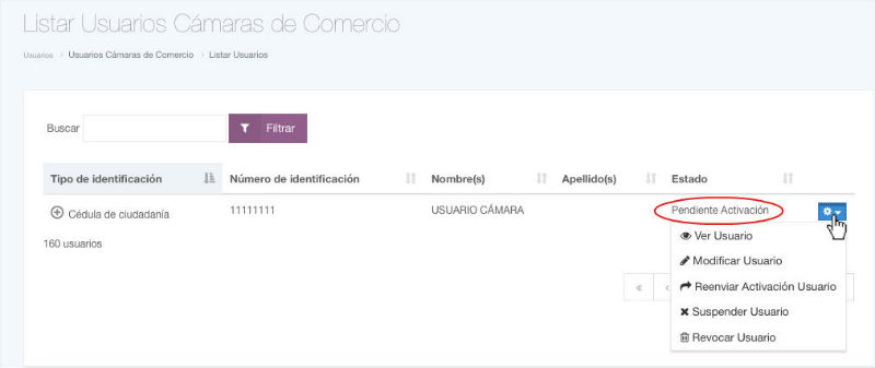 Las opciones en este estado son: Ver Usuario, Modificar Usuario, Reenviar Activación Usuario, Suspender Usuario y Revocar Usuario.