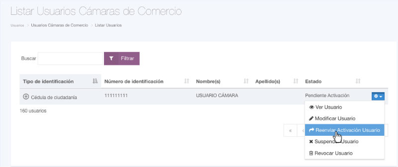 Haga clic en la opción Reenviar Activación Usuario, que se encuentra en el menú del usuario correspondiente, en el listado de usuarios. Mientras el usuario se encuentre en estado pendiente de activación.