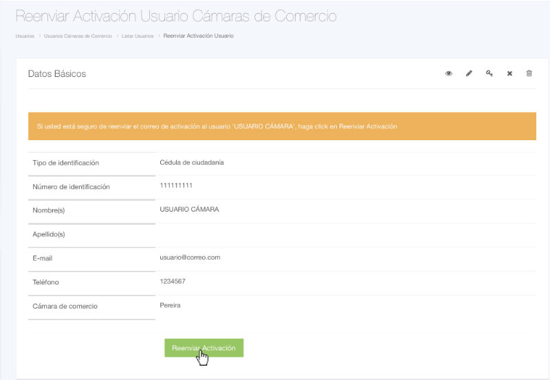 En la ventana siguiente se mostrará la confirmación de esta acción, revise la información del usuario y si esta seguro de querer enviar nuevamente la solicitud de activación haga clic en Reenviar Activación.