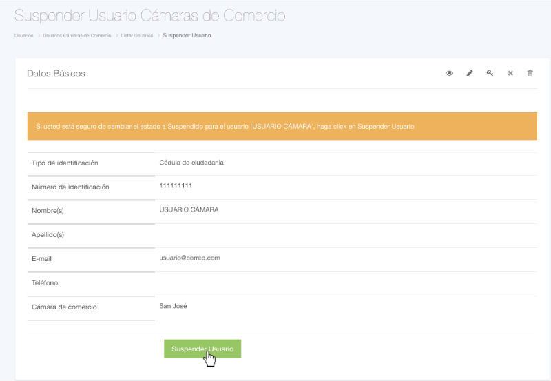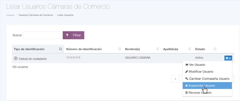 Haga clic en la opción Suspender Usuario, que se encuentra en el menú del usuario correspondiente, en el listado de usuarios.