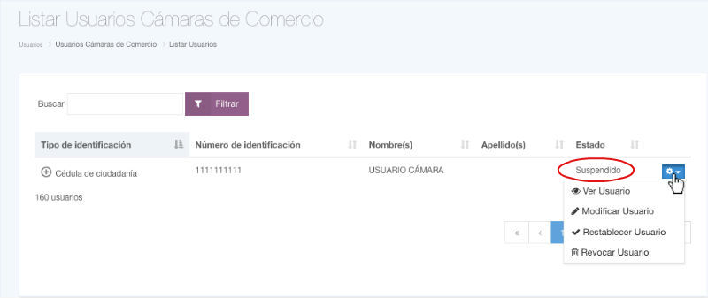 El usuario se mostrará como 'Suspendido' en su estado. Las opciones en este estado son: Ver Usuario, Modificar Usuario, Restablecer Usuario y Revocar Usuario.