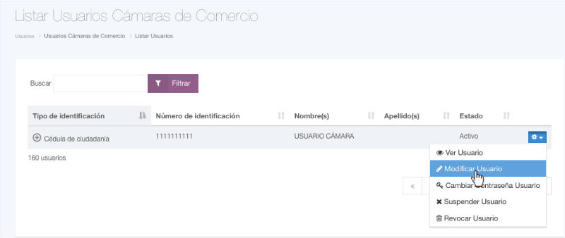 Para modificar la información de un usuario cámara de comercio haga clic en la opción Modificar Usuario, que se encuentra en el menú del usuario correspondiente, en el listado de usuarios.