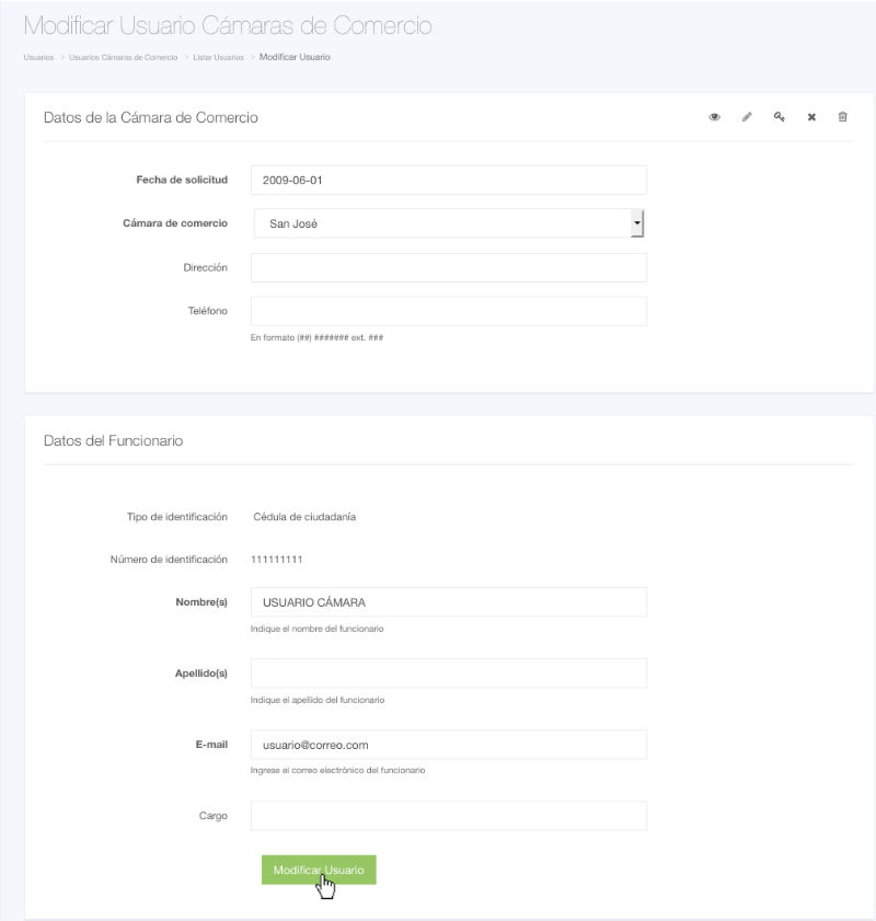 En este formulario podrá modificar los datos del usuario cámara de comercio. Cuando realice todos los cambios que considere necesarios, presione el botón Modificar Usuario para guardar los cambios.
