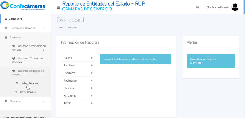 Haga clic en la opción Listar Usuarios después de haber desplegado el menú de Usuarios y de Usuarios Entidades del Estado que se encuentran a la izquierda, para ver la lista de usuarios.