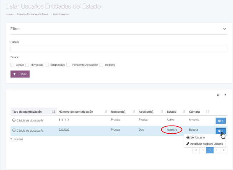Las opciones con un usuario en este estado son: Ver Usuario y Actualizar Registro Usuario.