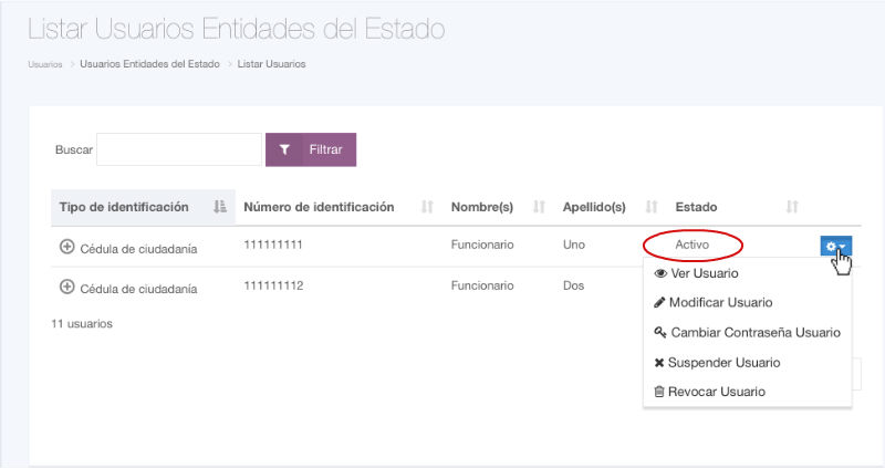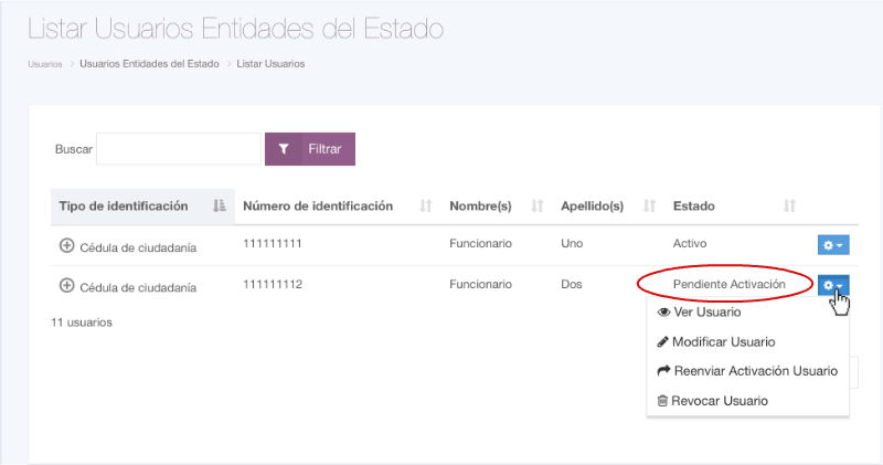 Cuando se registra una solicitud para la creación de un nuevo usuario Entidad del Estado, esta resalta en el listado de usuarios entidad del estado debido al sombreado azul en la fila del registro correspondiente.