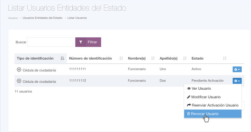 Haga clic en la opción Revocar Usuario, que se encuentra en el menú del usuario correspondiente, en el listado de usuarios.
