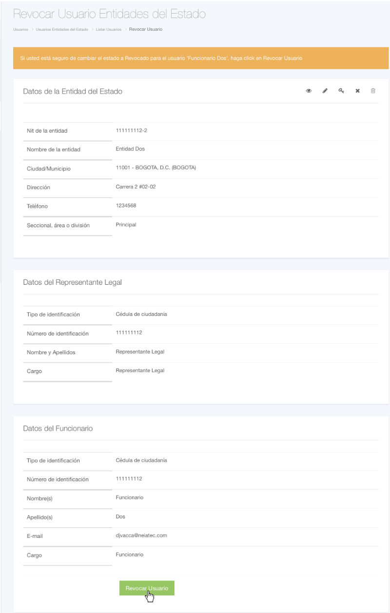 En la ventana siguiente se mostrará la confirmación de esta acción, revise la información del usuario y si esta seguro de querer revocarlo haga clic en Revocar.