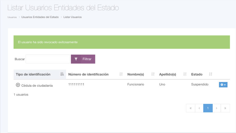 Será redirigido al listado de usuarios y un mensaje le confirmará si la acción se realizó correctamente. El usuario quedará como Revocado en su estado y no se le dará ninguna opción, solo quedará el historial de la cuenta.