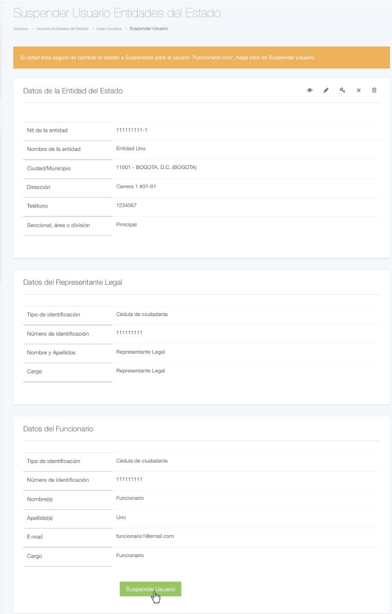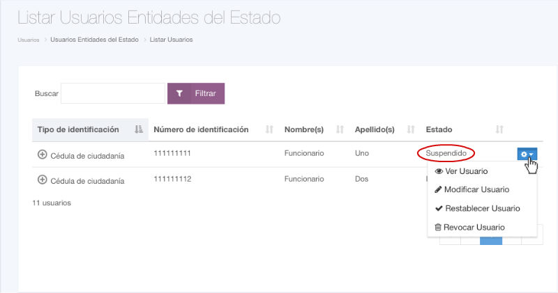 Haga clic en la opción Suspender Usuario, que se encuentra en el menú del usuario correspondiente, en el listado de usuarios.